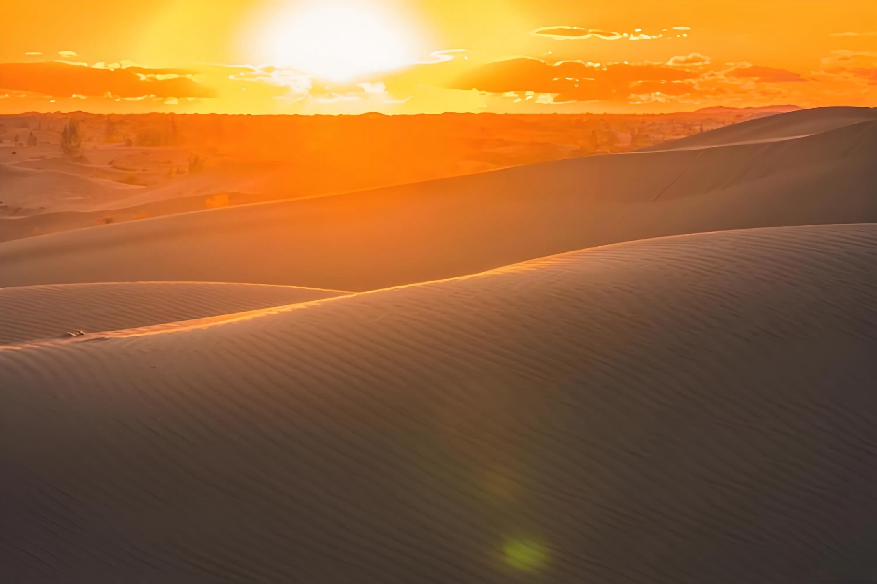 广袤的沙漠在夕阳的照射下呈现出金色的光昔。